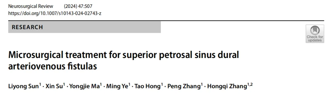 On August 29, 2024, the team of Professor Zhang Hongqi from the Department of Neurosurgery at Xuanwu Hospital of Capital Medical University published a research paper entitled “Microsurgical Treatment for Superior Petrosal Sinus Dural Arteriovenous Fistulas” in the journal Neurosurgical Review (JCR Q1, IF: 2.5). The co-first authors were Consultant Neurosurgeon Dr. Sun Liyong and post graduate student Su Xin from the Department of Neurosurgery at Xuanwu Hospital, and the corresponding author was Professor Zhang Hongqi from the Department of Neurosurgery at Xuanwu Hospital, Capital Medical University.