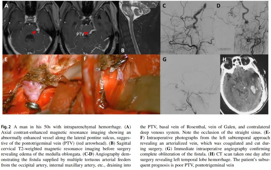 Figure 2. A man in his 50s with intraparenchymal hemorrhage. (A)Axial contrast-enhanced magnetic resonance imaging showing an abnormally enhanced vessel along the lateral pontine sulcus, suggestive of the Ponto trigeminal vein (PTV) (red arrowhead). (B) Sagittal cervical T2-weighted magnetic resonance imaging before surgery revealing edema of the medulla oblongata.(C.D) Angiography demonstrating the fistula supplied by multiple tortuous arterial feeder Strom the occipital artery, internal maxillary artery, etc.. draining into the PTV, basal vein of Rosenthal, vein of Galen, and contralateral deep venous system, Note the occlusion of the straight sinus. (E.F) Intraoperative photographs from the left sub temporal approach revealing an arterialized vein, which was coagulated and cut during surgery,(G)immediate intraoperative angiography confirming complete obliteration of the fistula. (H) CT scan taken one day after surgery revealing left temporal lobe hemorrhage, The patient's subsequent prognosis is poor PTV, Ponto trigeminal vein The patient's postoperative prognosis is poor.