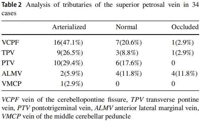 The most common arteriovenous branches of the internal carotid artery seen intraoperatively were the cerebellopontine fissure (VCPF), pons trigeminal vein (PTV), pons transverse vein (TPV), anterior lateral marginal vein (ALMV) and middle cerebellar peduncle vein (VMCP).