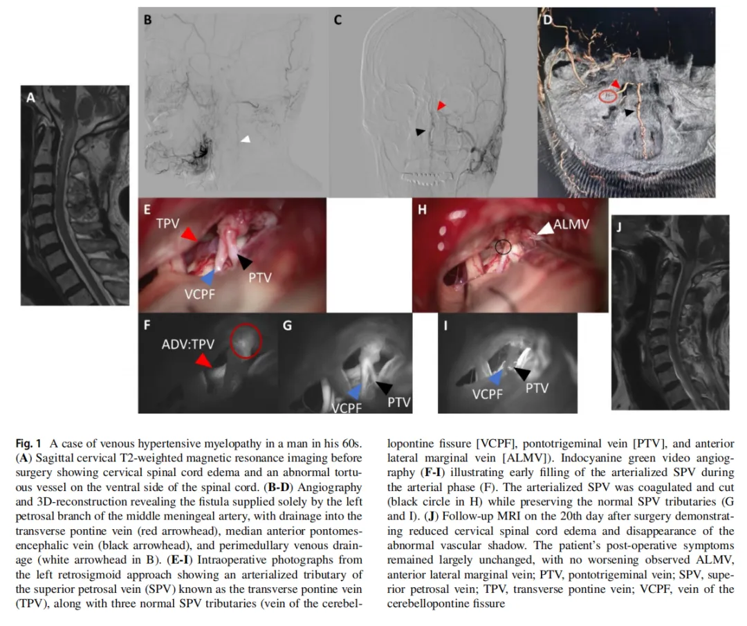 Figure 1. A case of venous hypertensive myelopathy in a man in his 60s(A)Sagittal cervical T2-weighted magnetic resonance imaging before surgery showing cervical spinal cord edema and an abnormal tortuous vessel on the ventral side of the spinal cord. (B-D) Angiography 3D-reconstruction revealing the fistula supplied solely by the left petrosal branch of the middle meningeal artery, with drainage into the transverse pontine vein (red arrowhead), median anterior Ponto mesencephalic vein (black arrowhead). and perimedullary venous drainage (white arrowhead in B).(E-l) Intraoperative photographs from the left retro sigmoid approach showing an arterialized tributary of the superior petrosal vein (SPV) known as the transverse pontine vein(TPV), along with three normal SPV tributaries (vein of the cerebellopontine fissure [VCPFl, Ponto trigeminal vein [PTV]. and anterior lateral marginal vein [ALMV]). Indocyanine green video angiography (F-D) illustrating early filling of the arterialized SPV during the arterial phase (F). The arterialized SpV was coagulated and cut(black circle in H) while preserving the normal SPy tributaries (Gand ). (J) Follow-up MRl on the 20th day after surgery demonstrating reduced cervical spinal cord edema and disappearance of the abnormal vascular shadow, The patient's post-operative symptoms remained largely unchanged.