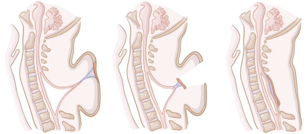 These types of diseases are not common in clinical practice. The traditional surgical plan is to completely free the herniated spinal cord from the inside of the cyst wall under intraoperative electrophysiological monitoring, and then cut fascia tissue from other parts of the body to construct the missing dura. After discussing with Professor Fengzeng Guan and Zanzhen Chen, Duan Wanru innovatively proposed a new plan, which is to free the spinal cord together with the attached connective tissue (“umbrella handle and mushroom umbrella”) as a whole from the inner wall of the sac, release the cerebrospinal fluid and return the spinal cord to its position, and then watertightly suture the edge of the free connective tissue to the edge of the normal dura mater.