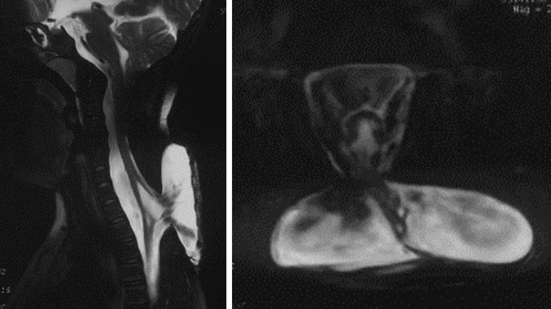 Preoperative MRI images show that the nerves have been pulled out of the spinal canal with the cystic hernia