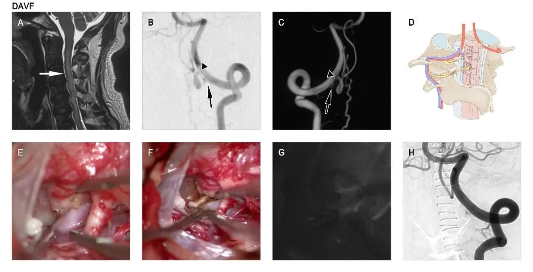 A male with CCJ DAVF patient started with venous hypertensive myelopathy and underwent microsurgery. T2-weighted sagittal MRI image (A) shows cervical medullary high signal and flow-vessel shadows (white arrows in A). Preoperative angiography of the left vertebral artery (B and C). This AVF is supplied by the dural branch of the left C-1 vertebral artery (black arrow in B and C), which drains into the intradural vein (black triangle in B and C). Schematic diagram of the AVF (D) vascular configuration. Intraoperative image showing the AVF and draining vein (E). Intraoperative images and ICG fluorescence angiography show the AVF (F and G) severed. Left vertebral artery angiography at 4 days postoperatively (H).