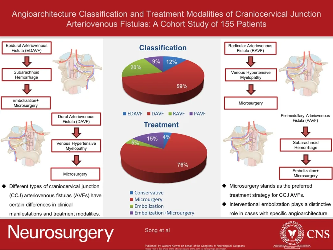 Recently, Prof. Zhang Hongqi's team from the Department of Neurosurgery, Xuanwu Hospital, Capital Medical University, published a paper entitled "Angioarchitecture Classification and Treatment Modalities of Craniocervical Junction Arteriovenous Fistulas: A Cohort Study of 155 Patients". Dr. Song Zihao, Dr. Ma Yongjie, and Dr. Tu Tianqi from the Department of Neurosurgery at Xuanwu Hospital were the co-first authors of the paper, and Prof. Ye Ming and Prof. Zhang Hongqi from the Department of Neurosurgery at Xuanwu Hospital of Capital Medical University were the corresponding authors.