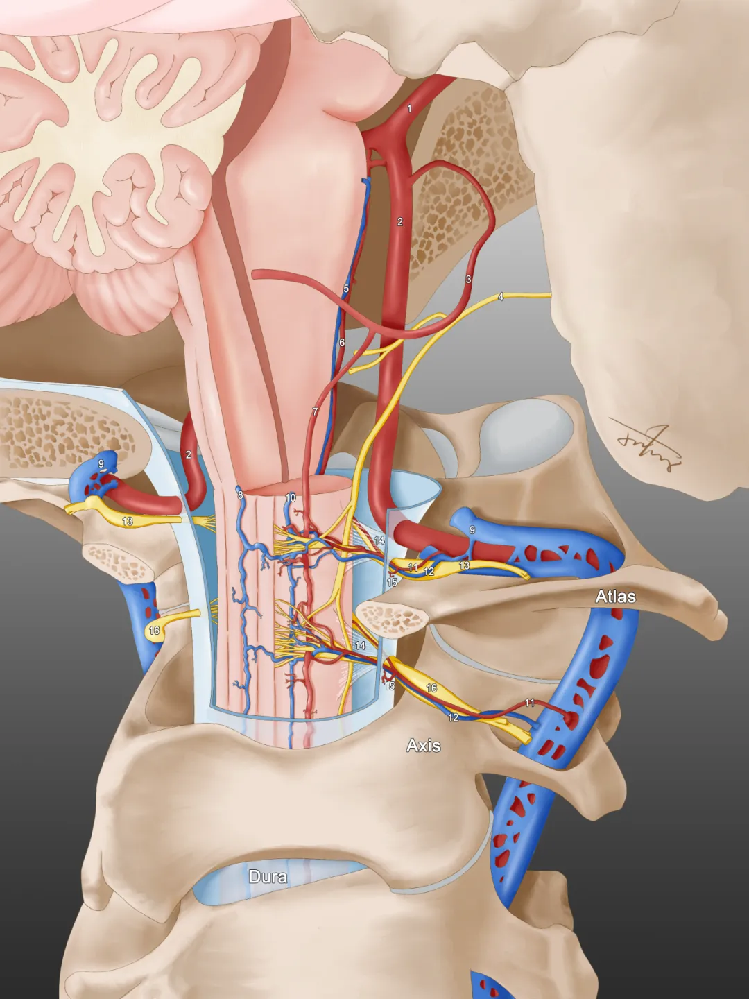 Schematic anatomy of the craniocervical junction region. (1) basilar artery, (2) vertebral artery, (3) posterior inferior cerebellar artery, (4) parasympathetic nerves, (5) anterior median vein of the spinal cord, (6) anterior spinal artery, (7) lateral spinal arteries, (8) posterior median vein of the spinal cord, (9) paravertebral venous plexus, (10) posterior lateral vein of the spinal cord, (11) root artery of the nerves, (12) root veins of the nerves, (13) cervical nerve root of cervical 1, (14) dentate ligament, (15) dural branch of the vertebral artery, and (16) cervical 2 nerve root.