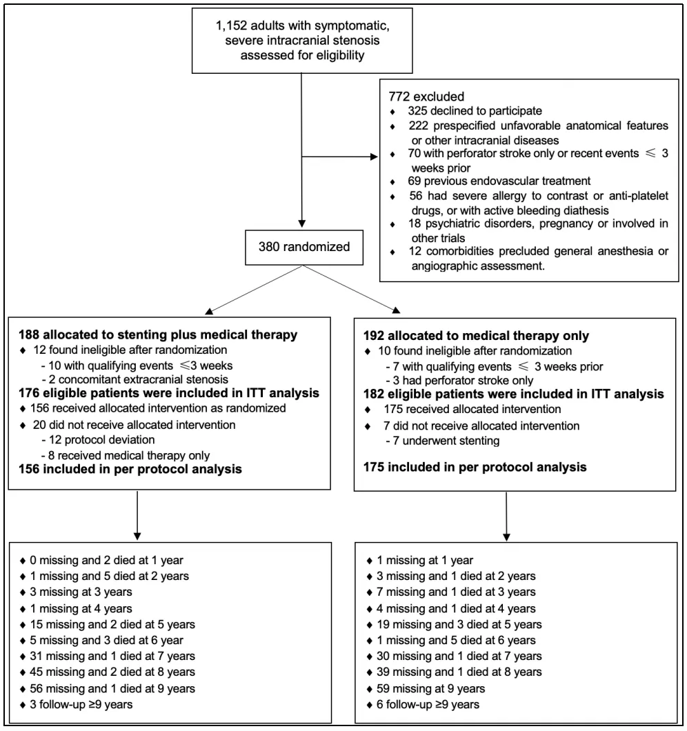 From March 2014 to November 2016, a total of 380 patients were enrolled and randomly assigned to the stenting group (188) and the medication group (192). Of these 380 patients, 358 (176: stent implantation group, 182: medication group) were identified as eligible and included in the FAS for final analysis (Figure 1). Of the 358 patients, 237 (66.2% completed) 7 years of follow-up.
