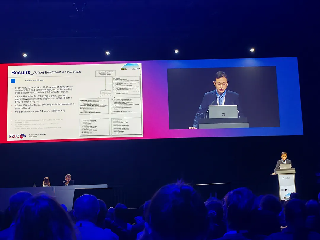 Dr. Gao Peng, Director of the Department of Neurosurgery, Xuanwu Hospital, Capital Medical University, delivered a lecture at the main session of the closing ceremony, entitled: Stenting Plus Medical Therapy vs. Medical Therapy Alone for Symptomatic Intracranial Atherosclerotic Stenosis: 7-Year Results of a Randomized Controlled Trial (CASSISS-FU).
