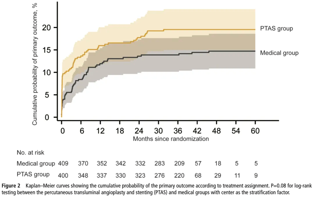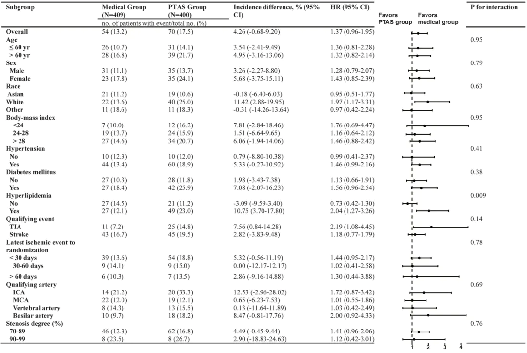 This pre-planned individual patient data (IPD) meta-analysis included 400 participants treated with PTAS and 409 treated with drug treatment alone from two large multicenter randomized clinical trials (SAMMPRIS and CASSISS). The results showed that there was no significant difference between PTAS treatment and drug treatment alone in terms of long-term stroke or death, but the short-term stroke risk of PTAS was significantly higher than that of drug treatment alone. Race, hyperlipidemia, and the type of responsible event may have a potential impact on the safety and efficacy of PTAS.