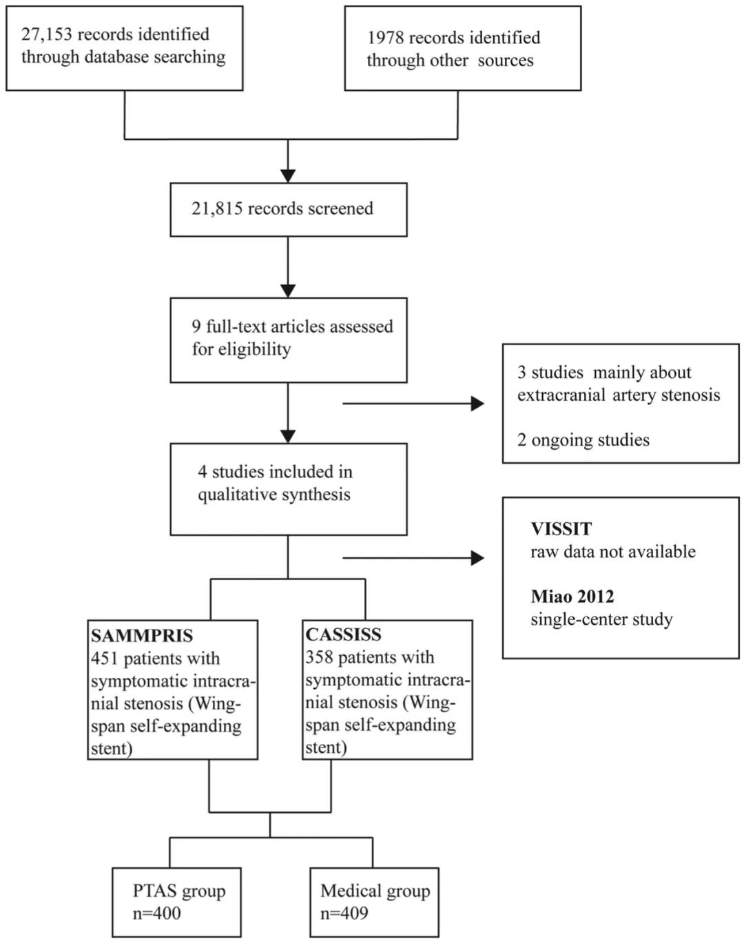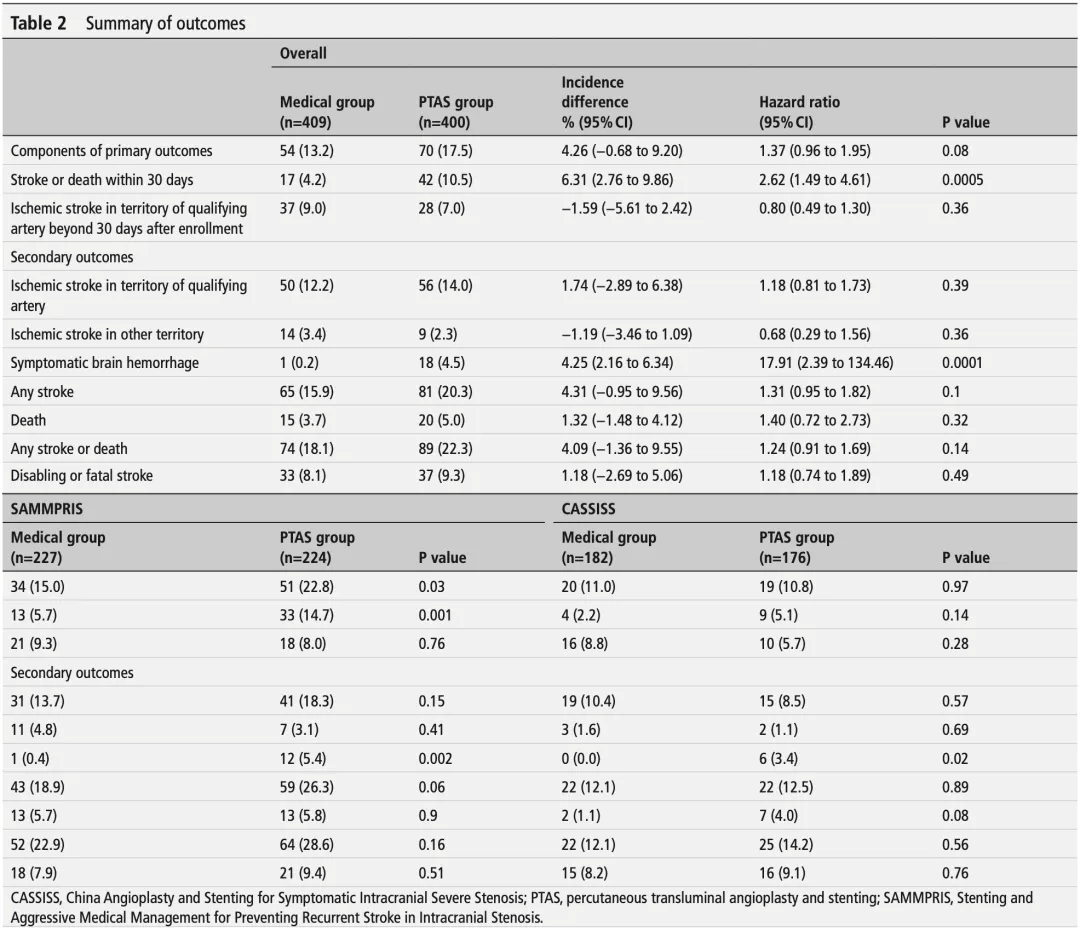 This pre-planned IPD analysis included 400 patients treated with PTAS and 409 patients treated with drug monotherapy alone from the two large multicenter randomized clinical trials SAMMPRIS and CASSISS. The primary outcome was stroke or death within 30 days of enrolment or an ischemic stroke in the territory of the responsible artery after 30 days of enrolment.