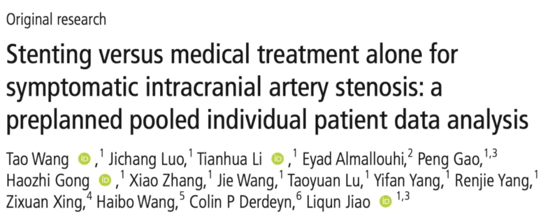 Wang T, Luo J, Li T, et al. Stenting versus medical treatment alone for symptomatic intracranial artery stenosis: a preplanned pooled individual patient data analysis. J Neurointerv Surg. Published online August 15, 2024. doi:10.1136/jnis-2024-022189